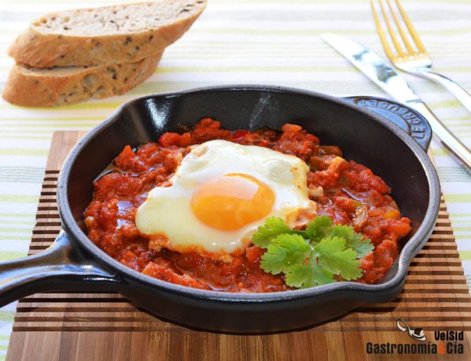 Con el nombre de Shakshuka, Shakshookah o Chakchouka (en árabe: شكشوكة; hebreo: שקשוקה) se conoce a este plato tradicional de la gastronomía árabe que parece que es originario de Túnez y muy popular en Marruecos, Egipto, Libia, Argelia y en Israel. En principio, se caracteriza porque los huevos se cocinan en la salsa de tomate también lleva comino, guindilla, cebolla y algunas verduras que pueden variar según la zona de elaboración o la temporada, normalmente se habla de pimientos, berenjena y calabacín.