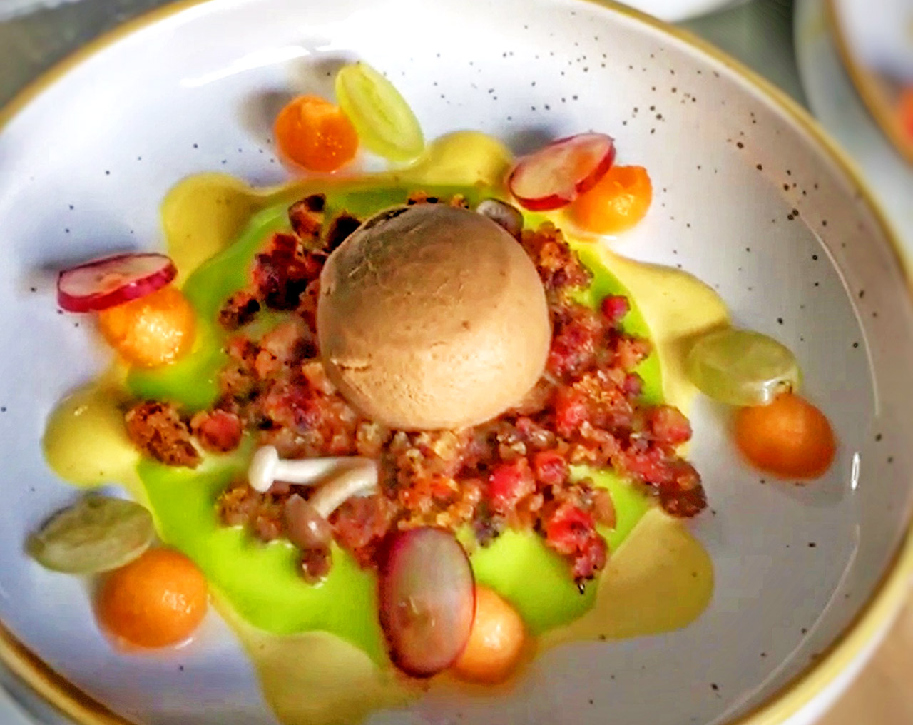 Este plato es una celebración del aceite de oliva virgen extra, protagonista indiscutible de la cocina mediterránea. Se construye en torno a la exquisita gamba roja que está curada en salmuera para potenciar su sabor. Se acompaña de una velouté elaborada con su fumé y para aportar frescura se incorpora un aguachile de aceitunas y piparra, además de un juego de texturas con migas de pan de aceitunas y AOVE, un gel de aceitunas y una emulsión de hinojo y AOVE.