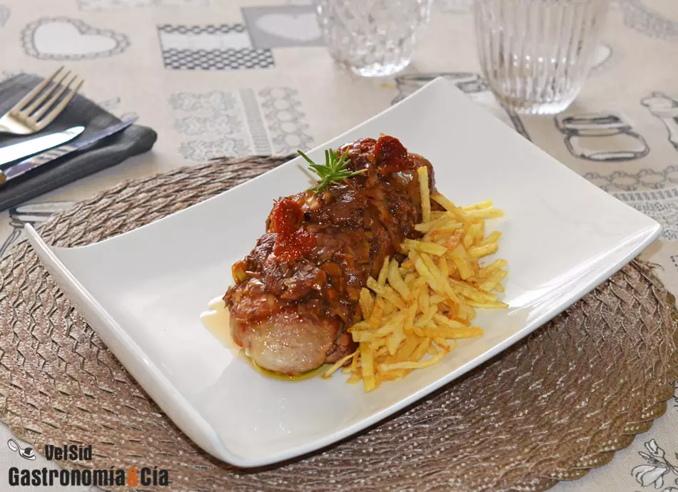 Sirve el solomillo con tomates secos y orejones en una fuente o bandeja y acompaña con las patatas fritas. También puedes servir directamente el solomillo cortado en raciones, con sus patatas. ¡Buen provecho!
