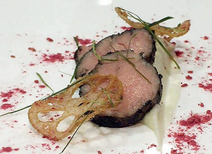 Disponer como base en el plato la crema de coliflor, encima colocar el solomillo de cerdo, repartir el cuscús de coliflor y terminar con el crujiente de flor de loto.