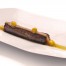 Limpiamos la lubina, sacamos un lomo y sumergimos en sal durante siete minutos. Limpiamos de sal, cortamos un trozo de lubina y lo sopleteamos. Reservamos.