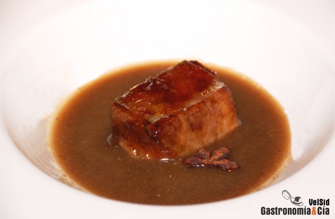 Marcar la papada en una sartén y calentar 5 minutos en el horno a 190° C. Disponer en el centro del plato la papada y sobre ella colocar la porción de manzana caramelizada. Verter un poco de sopa en el fondo del plato y decorar con unas gotas de aceite de oliva virgen extra.