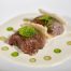 Hervir la leche y triturar junto con el queso. Hacer las esferas en el baño de alginato y reservar en aceite de oliva.