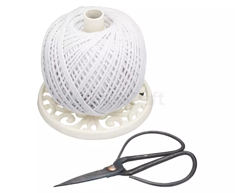 Hablamos del soporte de hierro fundido para hilo de cocina con tijeras que podéis ver en la foto superior, Kitchen Craft le ha dado el nombre de Cast Iron String Reel with Scissors, y también indica que es un set práctico para utilizar en el jardín, por ejemplo, si hay una planta aromática que necesita ser atada a un palo guía para su desarrollo.