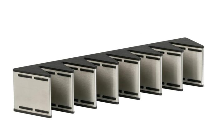 Podéis ver en las fotos el Magneto Knife Magnet diseñado por Poul Solbjerg y Peter Egelund para la firma Eva Solo, tiene capacidad para ocho cuchillos y dado su diseño, ocupa poco espacio en la pared, sus dimensiones son de 28 centímetros de ancho por 6 centímetros de alto. Está fabricado en acero inoxidable de calidad, caucho y un imán capaz de sostener los cuchillos grandes.