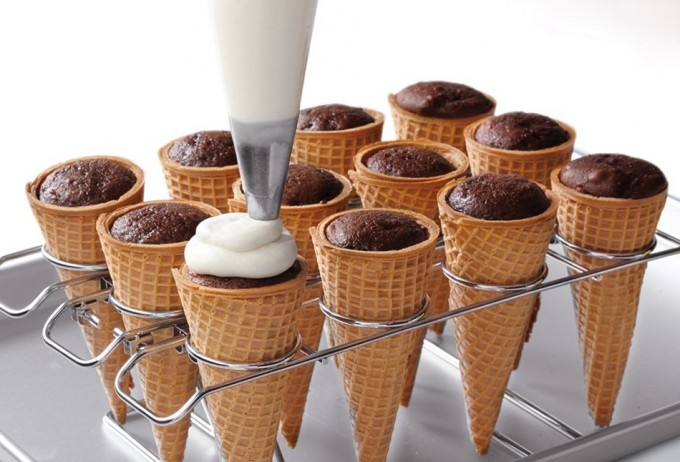 El soporte tiene capacidad para doce conos, y por supuesto, no sólo sirve para hornear los pastelitos, también para servirlos en una celebración con amigos o familiares. Y es aquí donde queremos llegar, porque no es que os estemos animando a que hagáis cupcakes en cono, sino que si buscabais una solución para presentar helados u otro tipo de elaboraciones culinarias en un cucurucho, quizá os interese este utensilio.