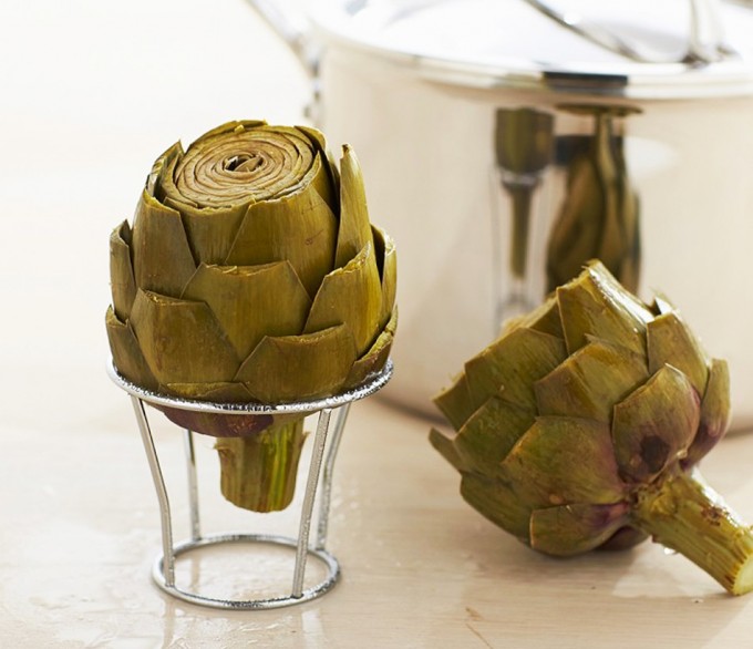 Nosotros no solemos hacer las alcachofas enteras al vapor, las cortamos en gajos si utilizamos este método de cocción, pero si es una elaboración que os gusta, quizá os llame la atención y os resulte práctico el soporte para hacer alcachofas al vapor que podéis ver sobre estas líneas. Es una sencilla estructura, pero está bien pensada.