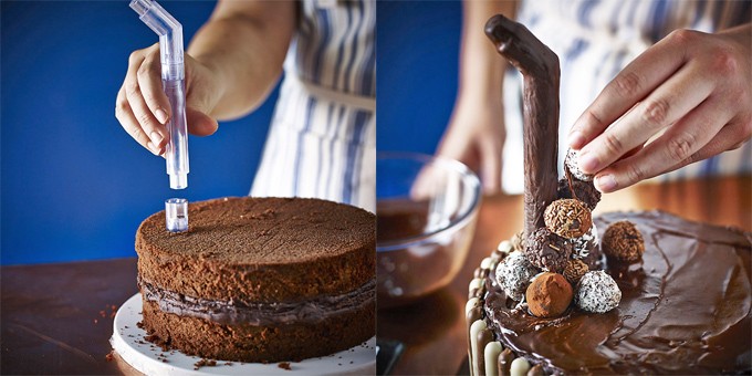 A continuación podéis ver un vídeo en el que se muestra cómo se utiliza el soporte para tartas que desafían a la gravedad, y cómo hacer un pastel de chocolate con una cascada de trufas que seguramente os hará salivar.