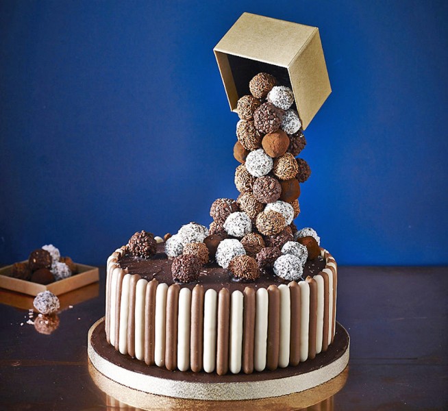 Como ya sabéis qué es un pastel que desafía la gravedad (gravity defying cake o anti-gravity cake), a pesar de que para hacerlo puede bastar con unas simples brochetas, queremos que conozcáis que también hay soportes específicos como el que os vamos a mostrar a continuación, es el que está oculto bajo la tarta que podéis ver en la foto superior, en la que una caja de trufas parece estar suspendida en el aire dejando caer su contenido sobre el pastel.