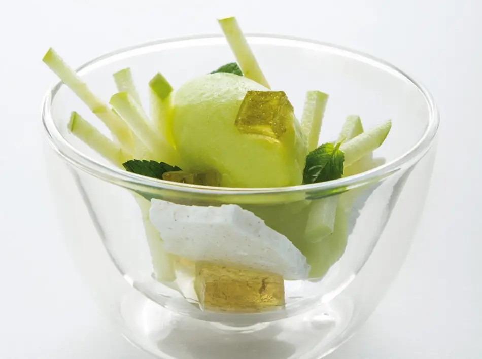 Colocar dos quenelles de sorbete de unos 60 gramos cada uno en el fondo del vaso. Utilizar una cucharada de manzanas impregnadas, cortadas a bastones. Depositar tres dados de 1’5 cm de pasta de fruta de limón sobre el sorbete y las manzanas. Decorar con hojas de menta y tres porciones de merengue de cardamomo de dos cm en corte irregular.