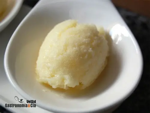 Cuando quieras degustar el sorbete de piña, rasca con una cuchara obteniendo la forma de una quenelle si es para servir en plato o déjalo unos minutos fuera del frigorífico y sirve en una copa o vaso para tomar como refresco.