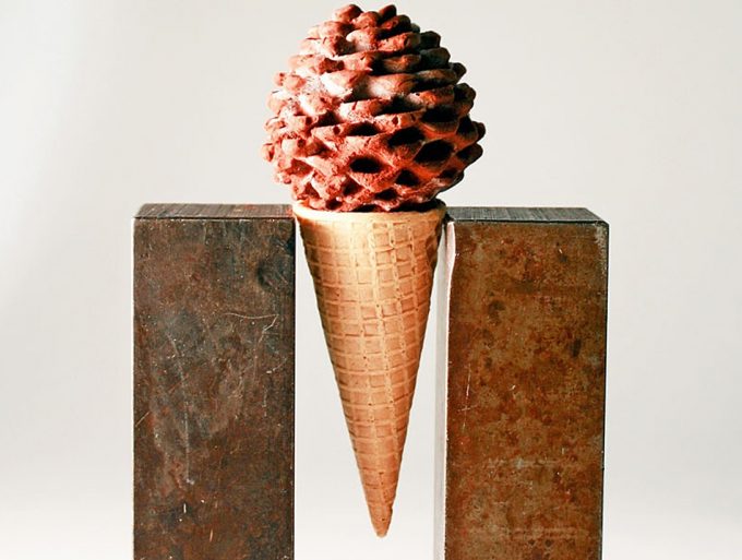 Rellenar un cono con dulce de leche, mermelada de higos y mascarpone ligeramente endulzado con miel. Colocar encima el sorbete desmoldado de piñones.