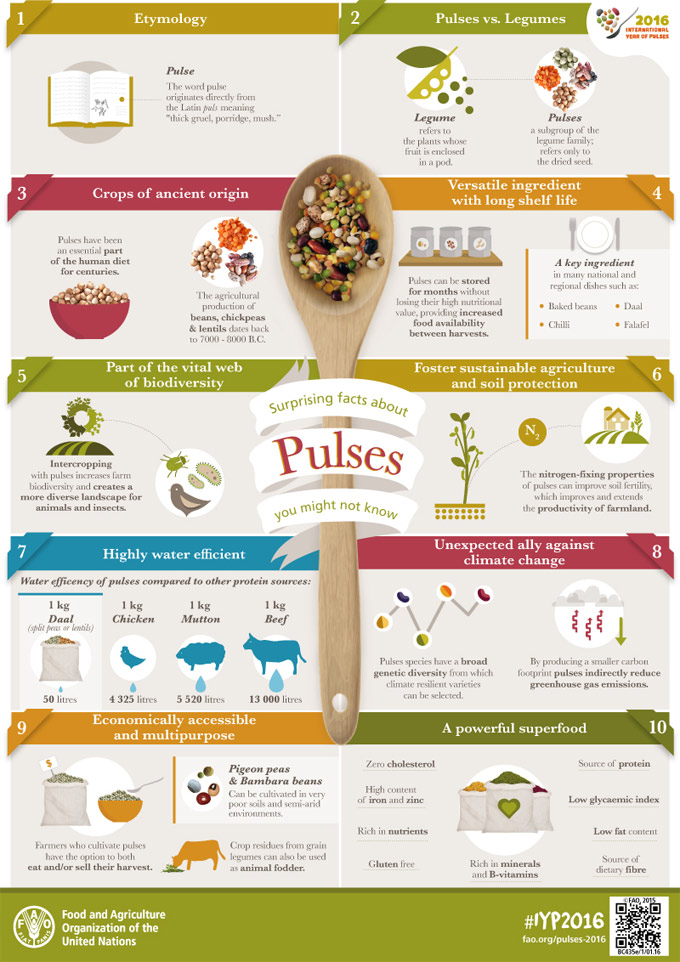 A través de la lista de eventos de la página podréis conocer las fechas y las actividades que están organizando países de todo el mundo en torno a las legumbres. También podéis acceder a una serie de estudios que se han publicado este año sobre la importancia de incluir este alimento en la dieta, cómo ayuda a combatir el cambio climático, su efectividad en el marco de una agricultura sostenible, etc. A continuación podéis ver la infografía, aunque es bastante simple, de un vistazo podemos ver de forma resumida todo lo que nos brinda este alimento.