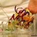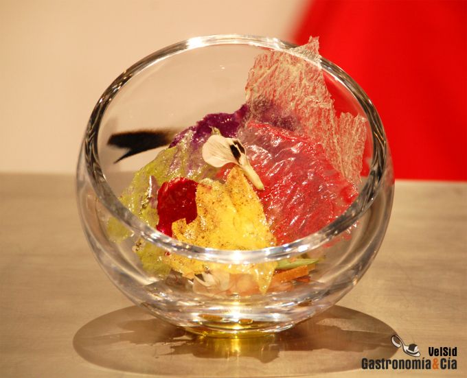 A estas láminas es necesario aportarles brillo y algo de flexibilidad, esto lo consigue pasándolas por aceite a 140-145º C. A continuación se aderezan, si conviene, con las huevas o el pescado en salazón desmigado. Susi Díaz y su equipo prepararon tenían chips de todos los colores para que los probáramos los asistentes, y realmente nos sorprendió, un aperitivo sabroso y liviano, sólo nos faltó una copita de un buen vino blanco para acompañar.