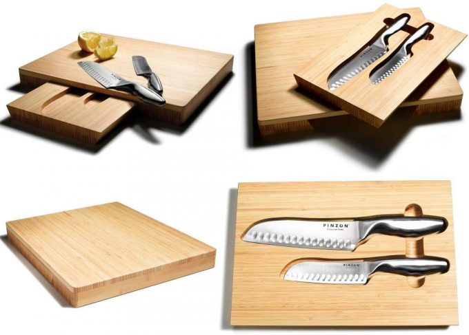 En Amazon nos ofrecen este juego, bajo el nombre Pinzon Santoku Knives and Bamboo Cutting Board Set, por casi 30$ (al cambio unos 20 euros). Es una tabla de cocina para cortar hecha con bambú e incorpora dos cuchillos de acero de una sola pieza de estilo japonés, de 13 y 18 centímetros respectivamente.