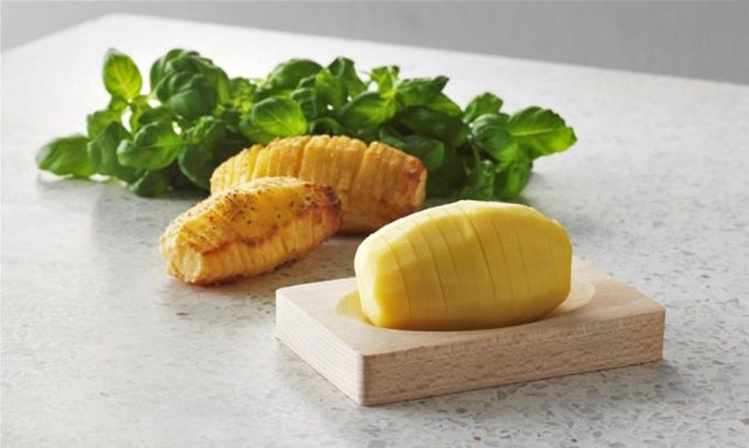 Otra opción es hacerse con el utensilio que podéis ver bajo estas líneas, es una tabla de corte para patatas Hasselback de la firma danesa Scanwood, quienes aseguran que todos sus productos son sostenibles. Utilizan distintos tipos de madera para fabricar los utensilios de cocina que siempre tienen una línea sencilla y elegante, y que resultan funcionales.