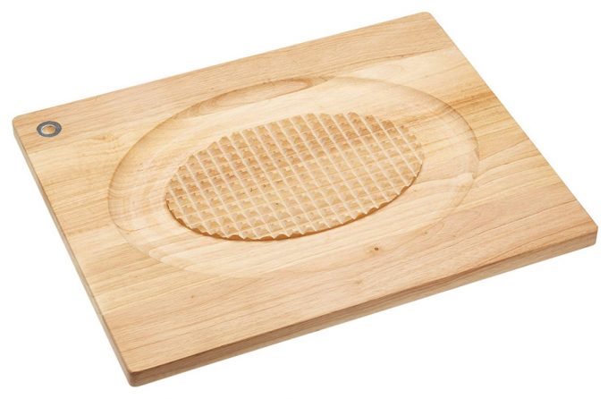 Como se puede apreciar en las imágenes, la tabla de trinchar tiene en el centro una superficie tachonada (de la misma madera) que ayudará a que la pieza de carne se mueva menos en el momento de cortarla, sea un redondo de ternera, un pavo asado, un solomillo, un chuletón… y a su alrededor tiene una hendidura o canal que se ocupará de recoger los jugos que suelte la carne desde el mismo momento en el que se coloca sobre la tabla para reposar.