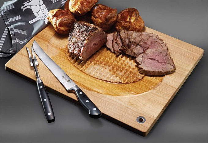 Por cierto, este jugo se puede recuperar para hacer una salsa sumándole el sabor del asado que se ha cocinado. También hay que decir que la tabla de trinchar por el otro lado es lisa y se podrá utilizar como cualquier tabla de corte cuando no se necesite como tabla de trinchar.