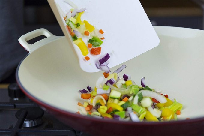 Otra característica positiva de estas tablas de corte desechables es que al ser flexibles, si se han utilizado para picar los ingredientes que se van a cocinar, después se pueden utilizar para llevarlos a la olla o sartén, como se hace con las palas y como podéis ver en la foto que dejamos bajo estas líneas.