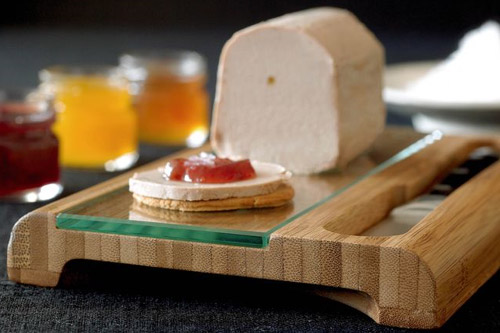 Vemos en la primera imagen la Tabla de Bambú con cuchillo untador para foie, sus medidas son 22x14x2’5 cm y está provisto de un cuchillo untador, con punta redondeada, de acero inoxidable. Su precio ronda los 18 euros.