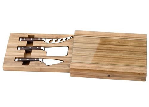 Otra buena idea para regalar es la Tabla de Bambú con tres cuchillos para degustación de quesos, como puedes ver, los cuchillos se extraen de un cajón, quedando toda la superficie de bambú (cubierta con cristal) libre para un perfecto servicio de la tabla de quesos. El precio de esta tabla ronda los 44 euros y sus medidas son de 27’5×21’5×4 cm.