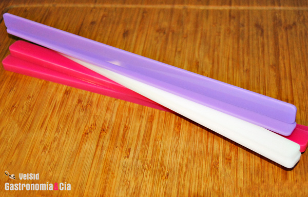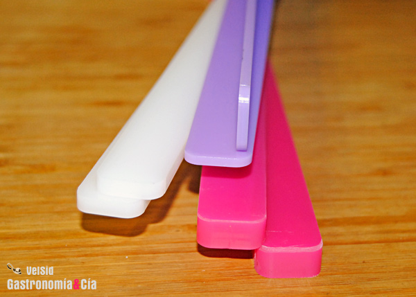 Como está muy de moda el fondant, con esta descripción se venden las tablillas niveladoras que podéis ver en la foto, tablillas niveladoras de fondant, pero evidentemente son útiles para otro tipo de masas. Hasta el momento, cuando hemos hecho masas de las que queríamos total homogeneidad en su grosor, utilizábamos una guías de madera, pero sólo teníamos un tamaño, así que hace unos días, cuando fuimos a comprar el pico vertedor, nos llevamos también estas tablillas.