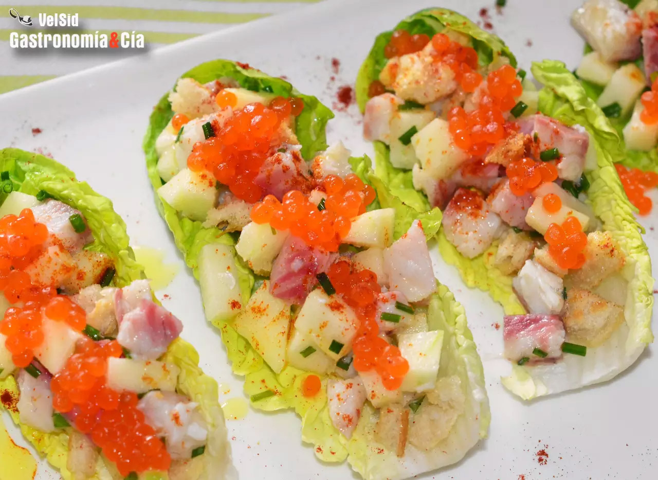 Lava las hojas de los cogollos de lechuga y escúrrelas bien. Prepara una vinagreta clásica con el aceite de oliva virgen extra, el vinagre y la sal, adereza el relleno de los cogollos y procede a rellenar las hojas.