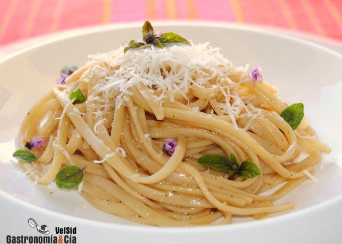 Quizá es poco sugerente el nombre de este plato, Tallarines en mantequilla marrón, lo hemos extraído del libro Pasta y al principio pensábamos que se trataría una mantequilla tostada o algo similar, pero no, la estrella del sabor de este plato, en principio, es el jugo de un asado de carne, pero también podemos utilizar un concentrado de carne, demi-glacé, lo importante es que esté sabroso, si está más o menos concentrado se puede aligerar o utilizar tal cual.