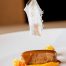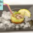 Marcar el tarantelo y reposar, después cortar a modo de tataki. Trazar en el plato un cordón de puré de berenjena y marcar encima tres puntos de compota de limón y tres de velouté de harissa. Colocar la cebolla encurtida sobre los puntos de limón y los brotes de cilantro sobre los puntos de harissa. En el centro servir un poco de caldo dashi y el tarantelo.
