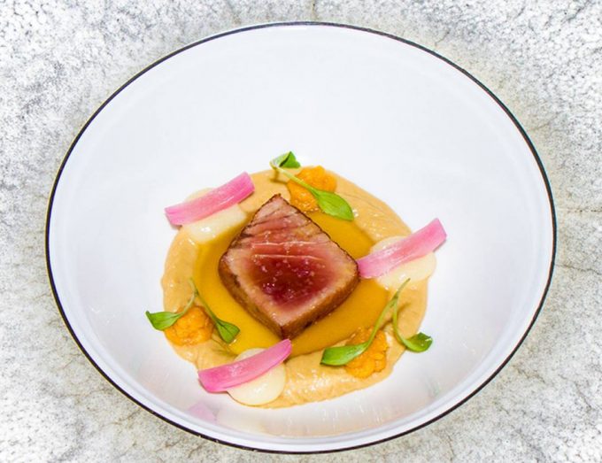 Pues ni guisado, ni crudo, en esta receta de la sección ‘Recetas de los Chefs’ el tarantelo se hace como un tataki, y aunque está creado en la cocina mediterránea, su autor se ha inspirado en la cocina asiática. Es importante decir también que este Tarantelo con puré de berenjena, dashi de hierbabuena, limón y harissa creado por el cocinero Juan Banda, fue el ganador de un certamen en el que representó al restaurante Audrey’s de Calpe (1 estrella Michelin). Si os gusta la cocina de inspiración asiática y os apasiona el atún rojo, tomad nota de esta receta para disfrutar en los fogones y en la mesa.
