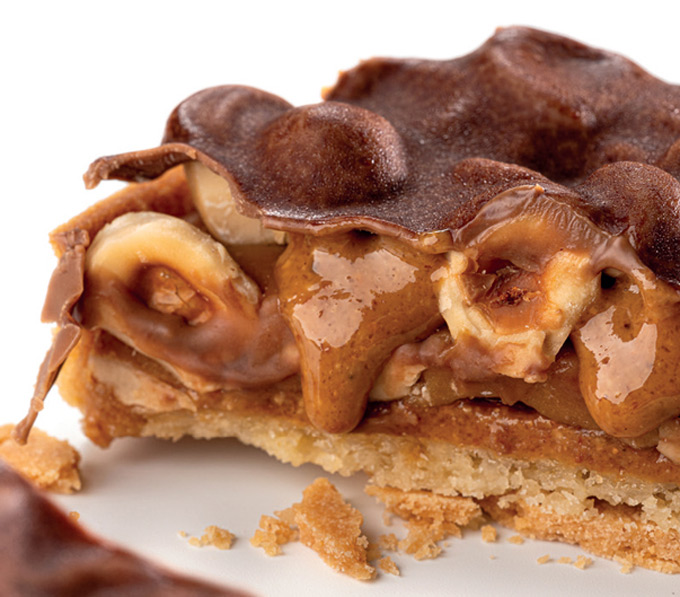 Una vez horneadas las tartas con el frangipane, colocar el praliné y el caramelo. Espolvorear las avellanas partidas por la mitad por toda la tarta, cubriendo tanto los lados como el centro. Colocar encima una placa de chocolate con leche de 14 cm de ancho, rociar con chocolate negro y calentar con ayuda de una pistola de aire caliente para que el chocolate se vaya moldeando a las avellanas de la superficie.