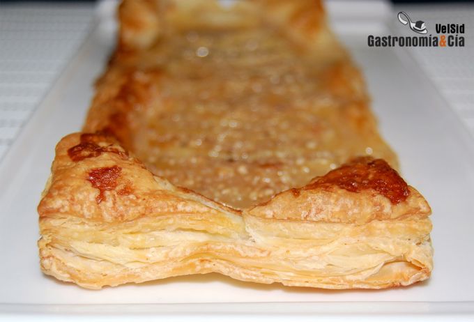Estira la masa de hojaldre sobre la superficie de trabajo ligeramente enharinada y pásala a la bandeja del horno cubierta con una lámina de teflón o papel vegetal. Pon en un cazo mantequilla y azúcar a partes iguales y calienta, deja cocer unos minutos, mezclando bien y pinta la masa de hojaldre.