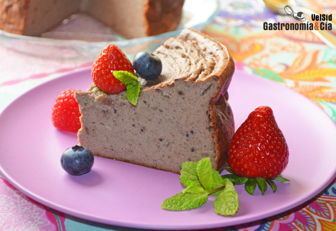 Desmolda la tarta de queso ricotta y açai para presentarla en una bandeja o soporte de tarta, puedes cubrirla con frutas rojas frescas, arándanos, frambuesas, fresas… unas hojitas de hierbabuena y a conquistar a los comensales. ¡Buen provecho!
