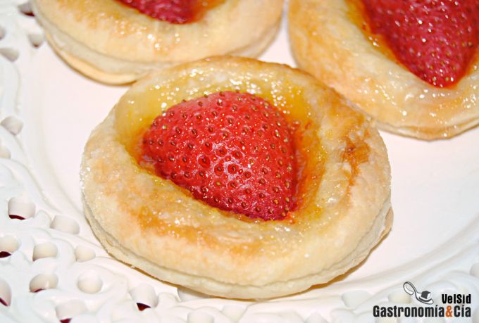 Corta el hojaldre y a continuación coloca en cada porción una cucharadita de mermelada, sobre ella coloca media fresa con el corte hacia abajo. Cuando tengas todas preparadas, espolvorea sobre las tartaletas el azúcar glas.