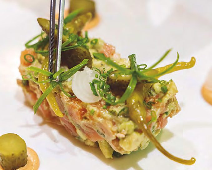 Cortar en daditos el aguacate, el foie y el salmón marinado y hacer un bloque rectangular con ayuda de un molde de emplatar, añadir los encurtidos y decorar con la mahonesa.