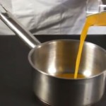 Para elaborar el caviar de mango diluimos el alginato en el jugo de mango. Llenamos una jeringuilla de esferificación de este producto y lo vamos echando gota a gota en la mezcla del agua y el cloruro cálcico. Dejamos 30 segundos en el cloruro cálcico y recogemos las esferificaciones con una cuchara colador. Lavar el caviar en agua. El caviar debe de ser elaborado en el momento para que no se gelatinicen por completo con el tiempo.
