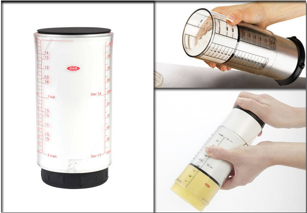 Nos parece un diseño ingenioso para una taza medidora, para quien utilice este sistema de medidas resultará además muy práctico para ingredientes que a veces dificultan su dispensación en el recipiente en el que se está preparando la receta, por ejemplo la mantequilla, que dada su untuosidad precisa de la ayuda de la lengua de cocina para que no queden restos en la taza medidora , en ese caso no se añadiría la cantidad medida a la elaboración.