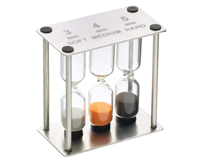 Lo cierto es que para hacer huevos cocidos con la yema hecha necesitamos más tiempo, como explicamos en su momento en este post (os interesará), pero como también hemos comentado, una vez que han finalizado los cinco minutos del último reloj de arena, le damos la vuelta y medimos tres o cuatro más, según nos convenga.