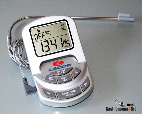 Además del uso básico, este termómetro digital de Lacor con sonda de acero inoxidable, dispone de funcionalidades muy útiles que nos permiten dedicar el tiempo a otros menesteres mientras estamos cocinando, nos avisa mediante señal acústica cuando llega a la temperatura marcada, en su pantalla nos muestra la temperatura de cocción y la temperatura límite, además el reloj y el temporizador, disponiendo de un contador ascendente/descendente.