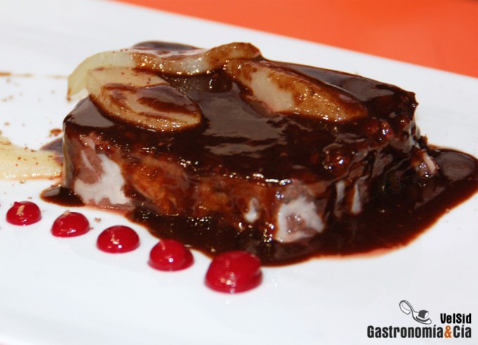 Montada la terrina, la ponemos a cocer al baño maría en el horno a 100º C hasta que el corazón de la terrina alcance los 45º C. Con los huesos y las verduras hacemos la salsa, que acabamos con la reducción de un buen vino tinto y chocolate.