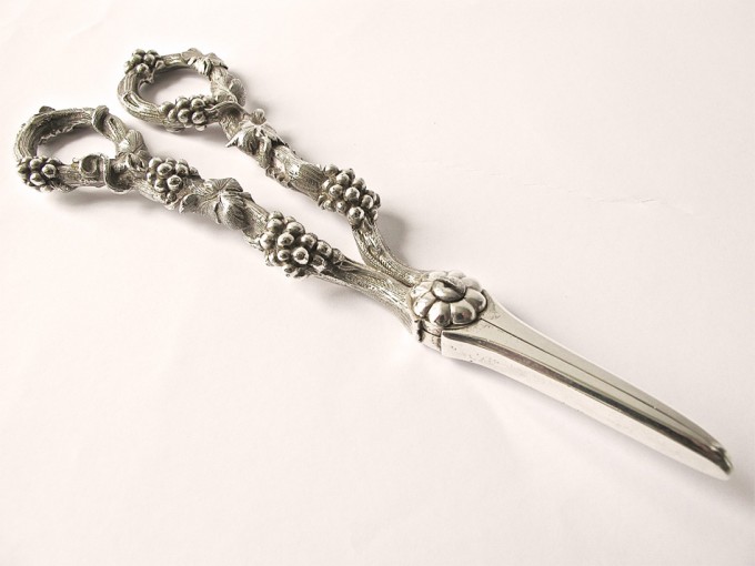 La tijera para racimos de uva de la primera foto están en eBay, parece ser que datan del año 1849, son de plata y tienen un largo de 18 centímetros, mientras que su peso es de algo más de 150 gramos. Como podéis contemplar, están decoradas con racimos de uva, hojas de vid y zarcillos.