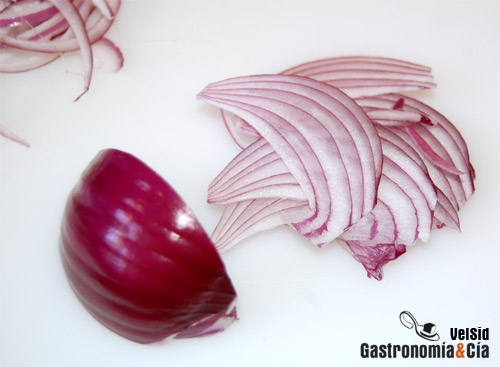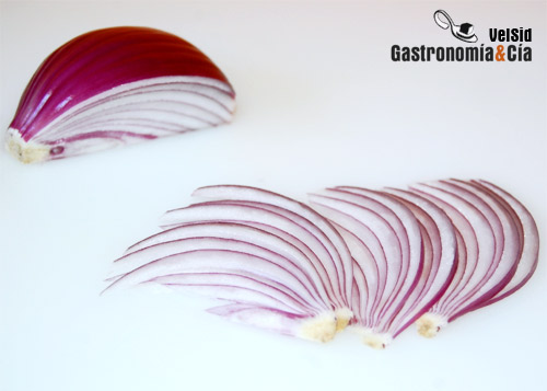 Si no habéis practicado anteriormente esta técnica de corte, veréis que es muy sencillo, para cortar la cebolla en pluma, después de pelarla hay que cortarla por la mitad, la cara cortada se pone sobre la mesa de trabajo, resultando la posición más estable para trabajar, y posteriormente se procede al corte bien fino de la cebolla, desechando los dos extremos (del inicio y del final del corte).