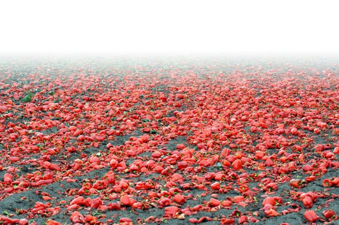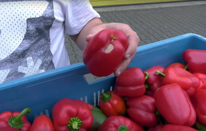 Eran pimientos de invernadero perfectamente comestibles, pero los elevados estándares de calidad de los supermercados, las regulaciones gubernamentales y que los consumidores tengan altas expectativas a la hora de comprar alimentos en cuanto a tamaño, forma y color, han provocado el enorme desperdicio realizado. Este agricultor ha desechado aproximadamente un millón de pimientos (25% de la cosecha) en unos terrenos en la localidad de Baarlo (Países Bajos) para utilizarlos como compost, pimientos que como ya hemos comentado, se podían haber aprovechado perfectamente para la elaboración de otros productos procesados.