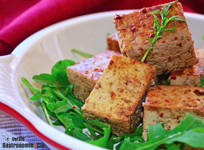 Sirve el tofu marinado con una ensalada, con unas hojas de rúcula, canónigos o berros, con un poco de col china cortada en juliana… Puedes acompañarlo con lo que desees, incluso con unas setas. ¡Buen provecho!