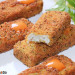 Pon en un plato los huevos batidos con un poco de sal y un chorrito de salsa de soja, en otro plato dispón el pan para empanar el tofu. Corta los bloques de tofu en barritas para tomar en dos bocados, y ponlas en el huevo batido.
