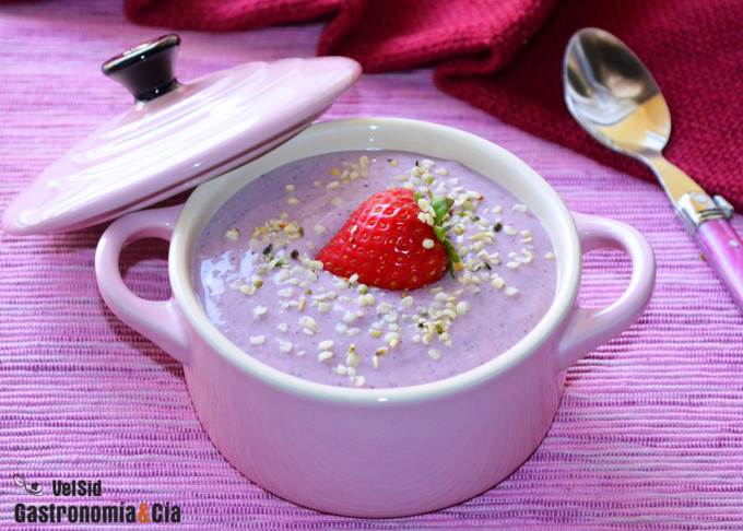 Vierte en cuatro cuencos o copas de postre la crema de tofu, fresas y açai, cubre con film transparente y deja reposar en el frigorífico para que coja cuerpo y los sabores se amalgamen.