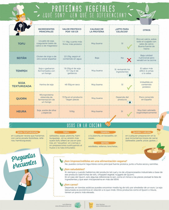 De momento, bajo estas líneas podéis ver la infografía que, según sus autores, “hace un repaso a los principales productos vegetales proteicos, además de las legumbres, semillas y frutos secos. Valorando su composición, aspectos más reseñables y usos.” Para ver la infografía sobre productos vegetales ricos en proteínas ampliada tenéis que pulsar sobre la imagen dos veces (no consecutivas), la veréis a toda pantalla.