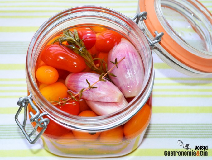 Los tomates encurtidos mantienen su atractivo aspecto, una piel fina y brillante, pero en su interior están tiernos, son como unas perfectas esferificaciones de tomate. Son ideales para servir como aperitivo, como guarnición o para hacer ensaladas, encantará a quienes disfruten de estas preparaciones con un toque de vinagre. En esta ocasión hemos utilizado tomillo y romero como hierbas aromáticas, pero también se pueden utilizar otras que sean de vuestro agrado, albahaca, orégano… cuando probéis estos cherry encurtidos ya nos contaréis qué os parecen.