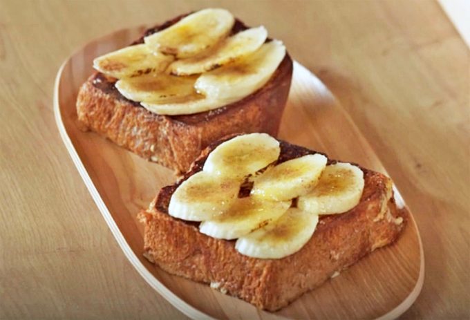 Cortamos el plátano en rodajas muy finas y las colocamos encima de las torrijas, espolvoreamos azúcar y le damos calor con el soplete para que caramelice. Por último, espolvoreamos un poco de canela, emplatamos y a comer.
