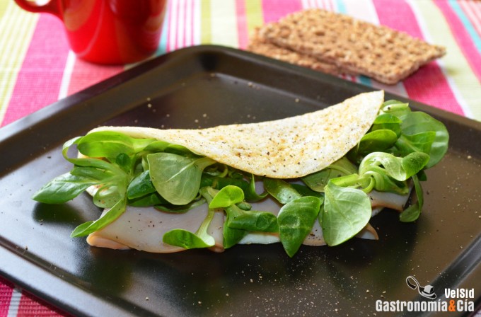Pasa la tortilla de claras especiada al plato, reparte el jamón de pavo y los canónigos en media tortilla y tapa con la otra media. También puedes enrollarla y servirla como un burrito. ¡Buen provecho!